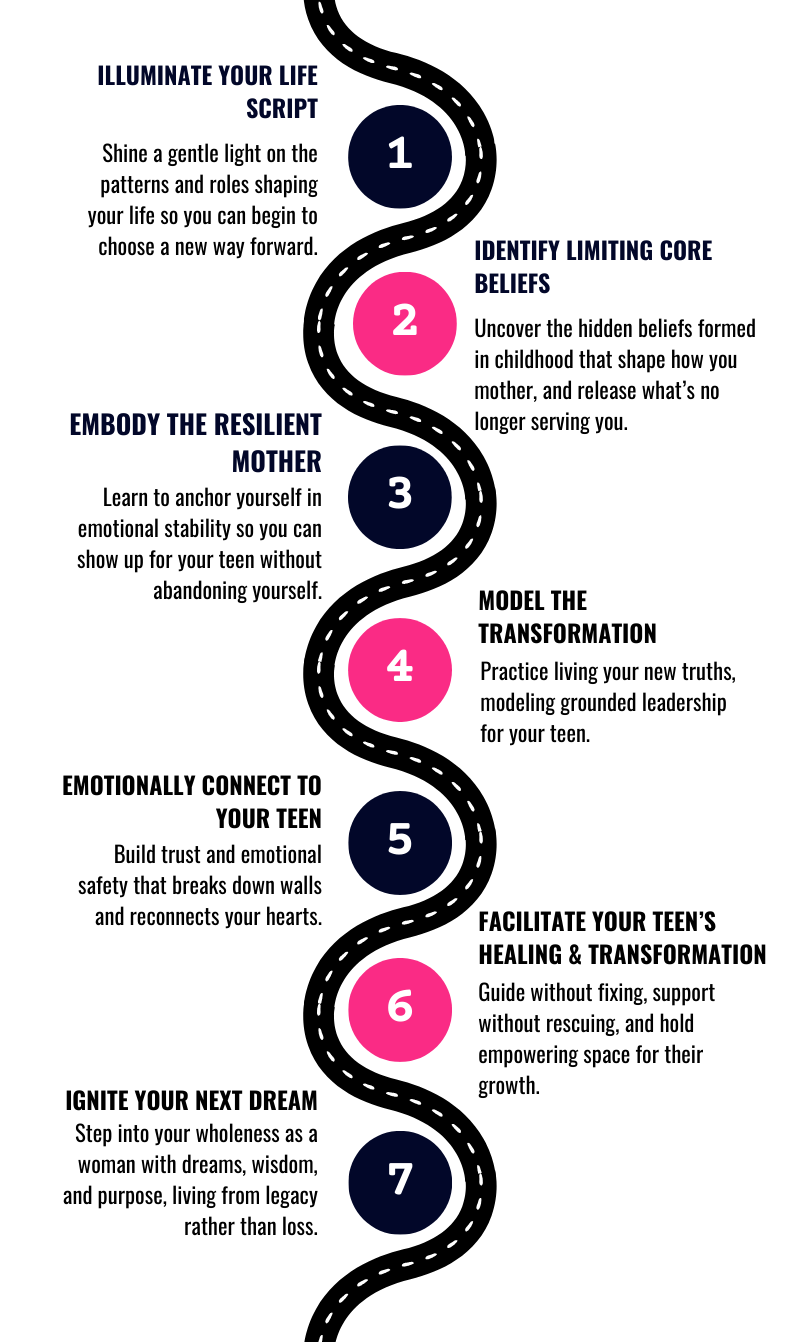 It’s a healing journey for the mother who knows that true change starts within. If you’ve found yourself repeating patterns you swore you’d never pass on—or struggling to connect with your teen through the chaos, guilt, or emotional exhaustion—this program is your path to something different.